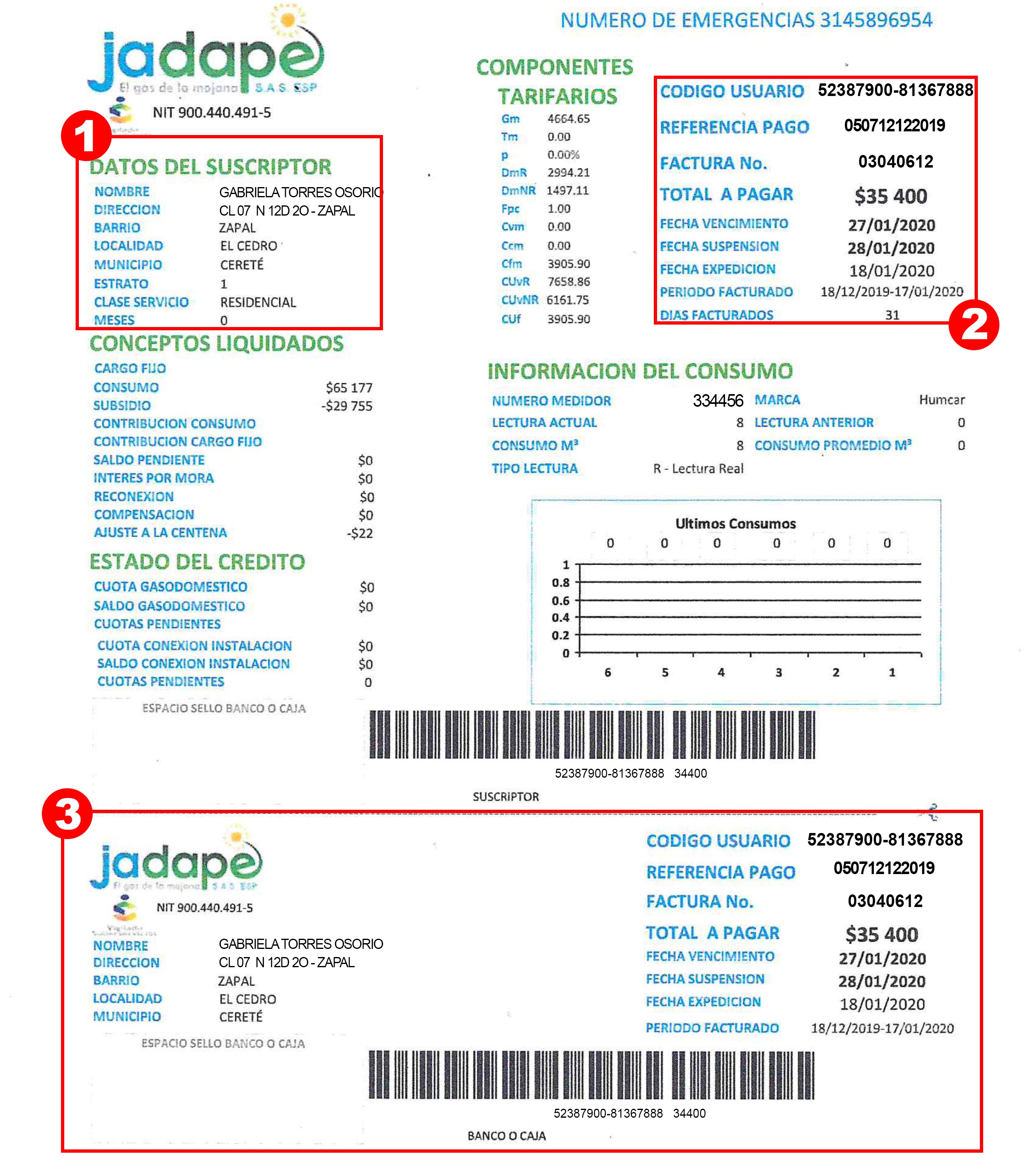 - 2) Encontraremos datos de la factura como: referencia de pago, numeró de factura, valor a pagar, período facturados
